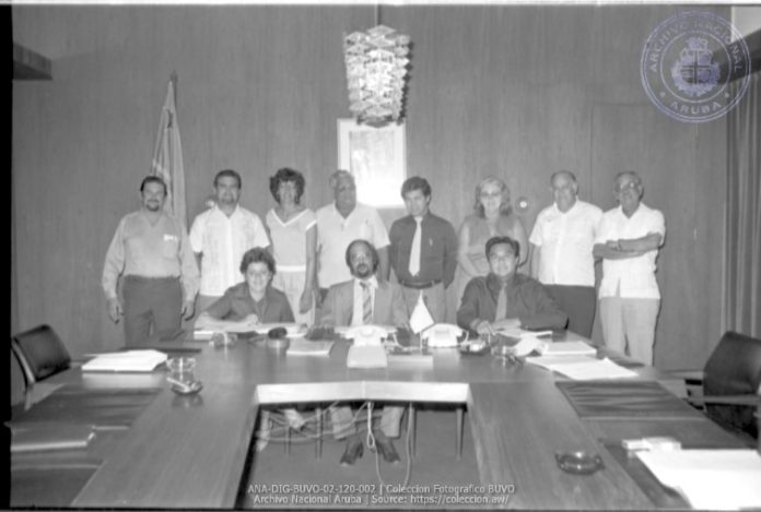 (Oranjestad)—Aruba’s flag came much later, after Aruba had already obtained its coat of arms and an anthem it could call its own. At the suggestion of the Island Government of Aruba, a commission was appointed in 1976 consisting of Julio Maduro, former head of the Department of Labor Affairs; Wouter van Romondt, former art teacher at Colegio Arubano; Ronald Donk; and Juan E. Wever as secretary. Their task was to organize a public competition for a flag design.